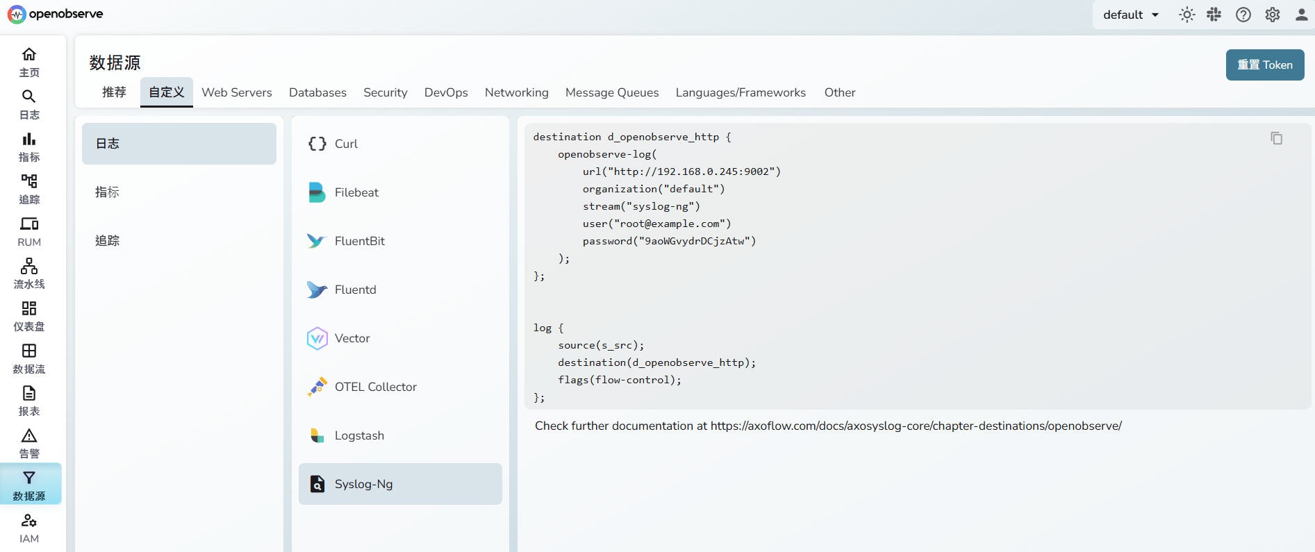OpenObserve 數據源找到Syslog-Ng設定,新增到/etc/syslog-ng/syslog-ng.conf