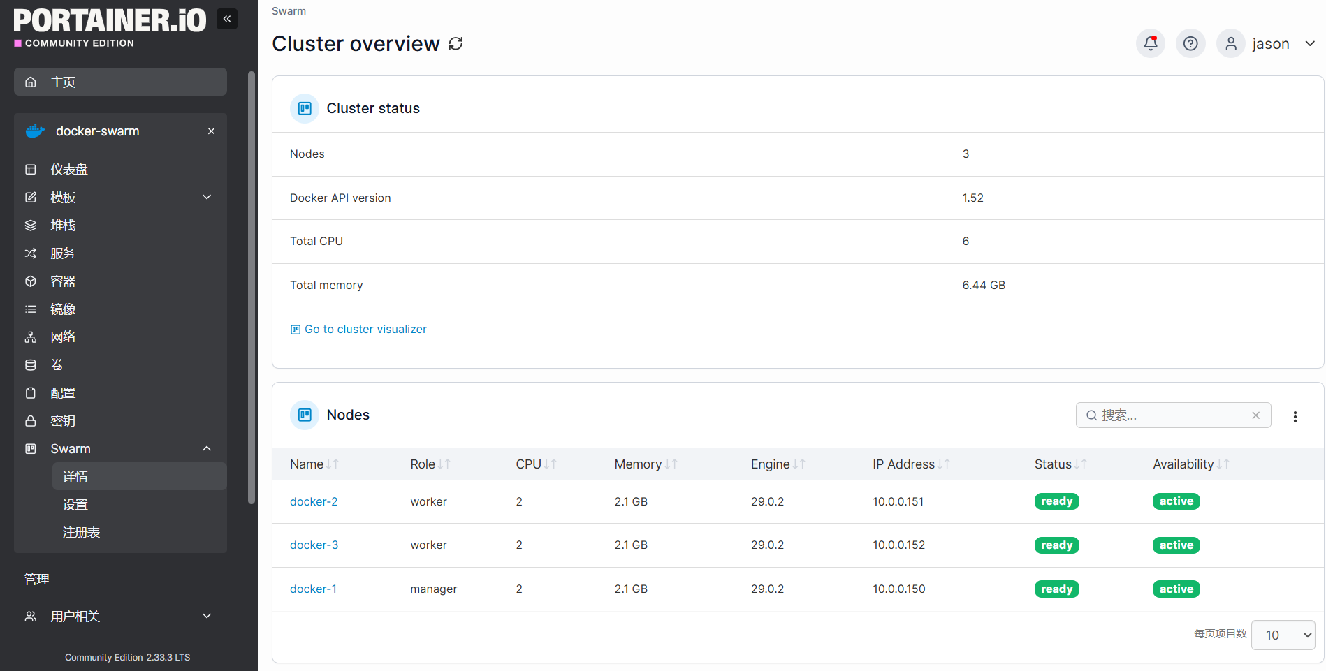 網頁上輸入https://ip:9443登入Portainer可以看到Swram資訊
