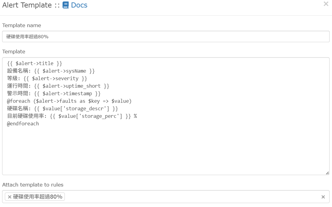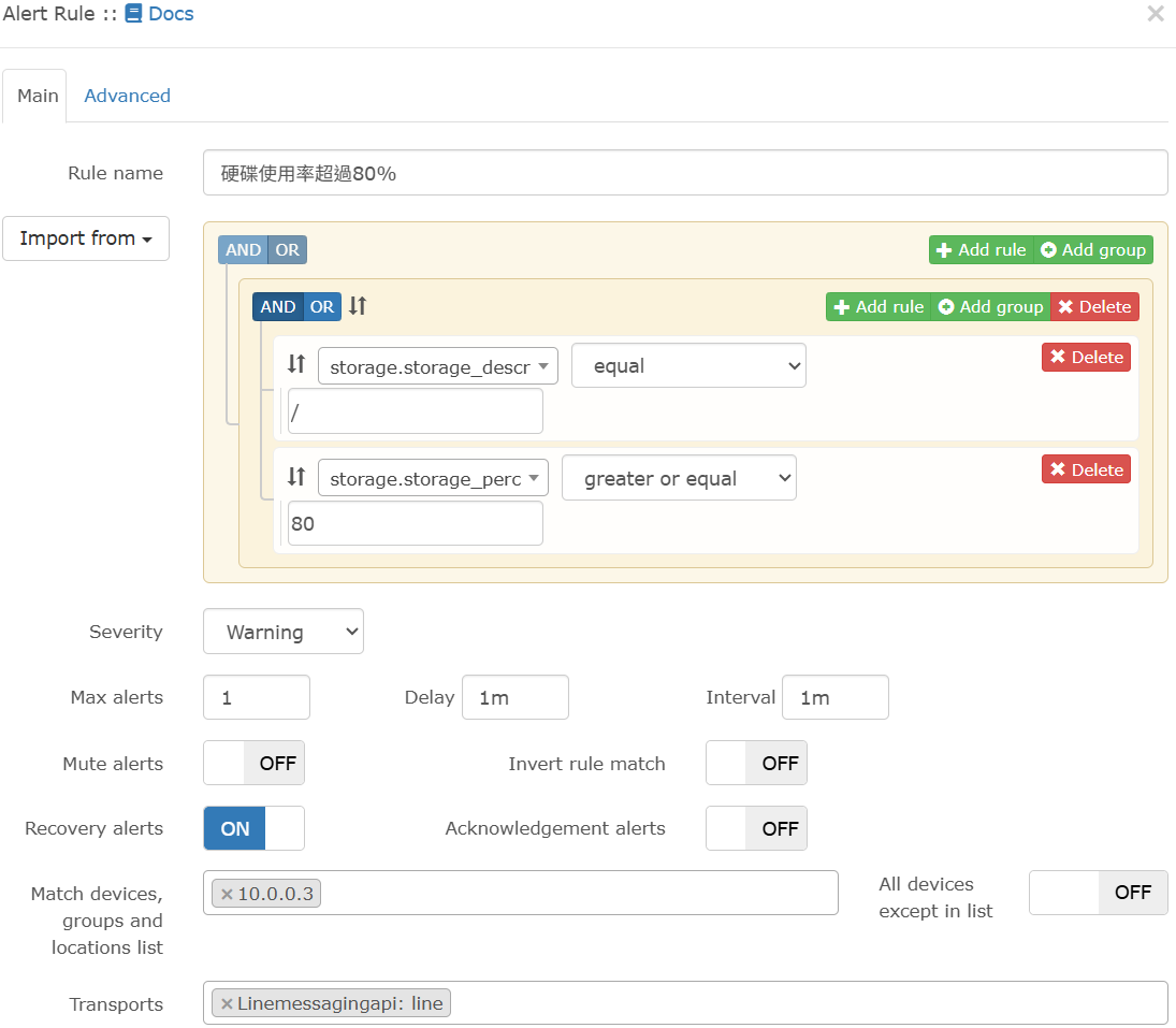 LibreNMS 硬碟使用率監控警報