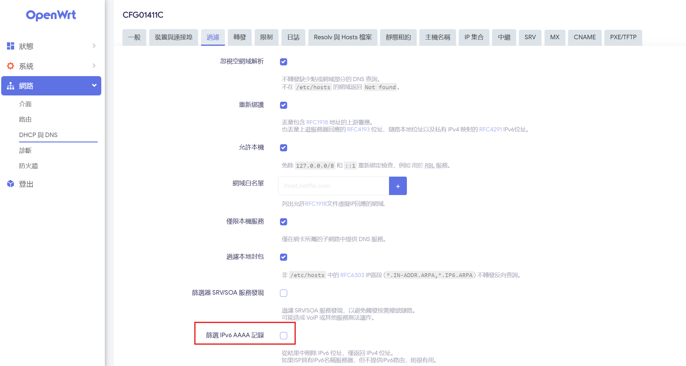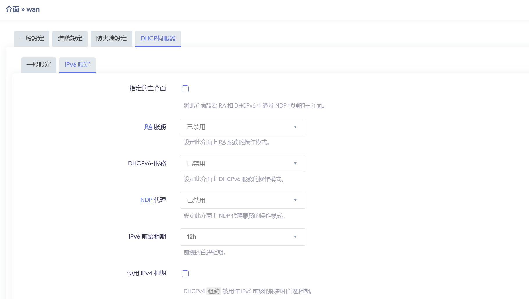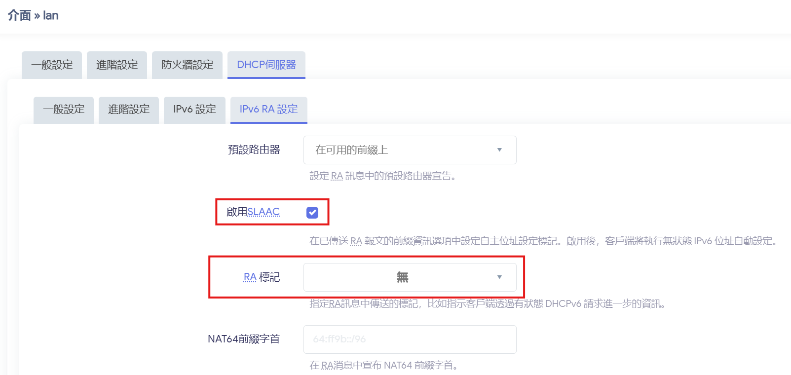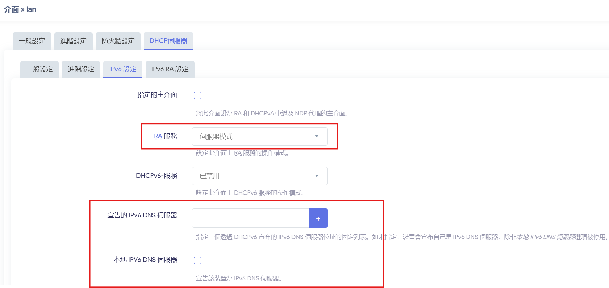 IPv6 DHCP設定,RA選伺服器模式,不勾選IPv6 DNS伺服器,用IPv4來解析IPv6域名