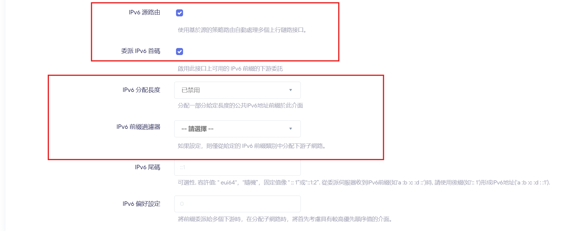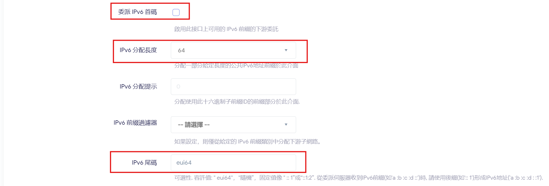 LAN介面>進階設定,委派 IPv6 首碼不勾選,IPv6 分配長度依照IPv6-前綴代理取得的長度設定