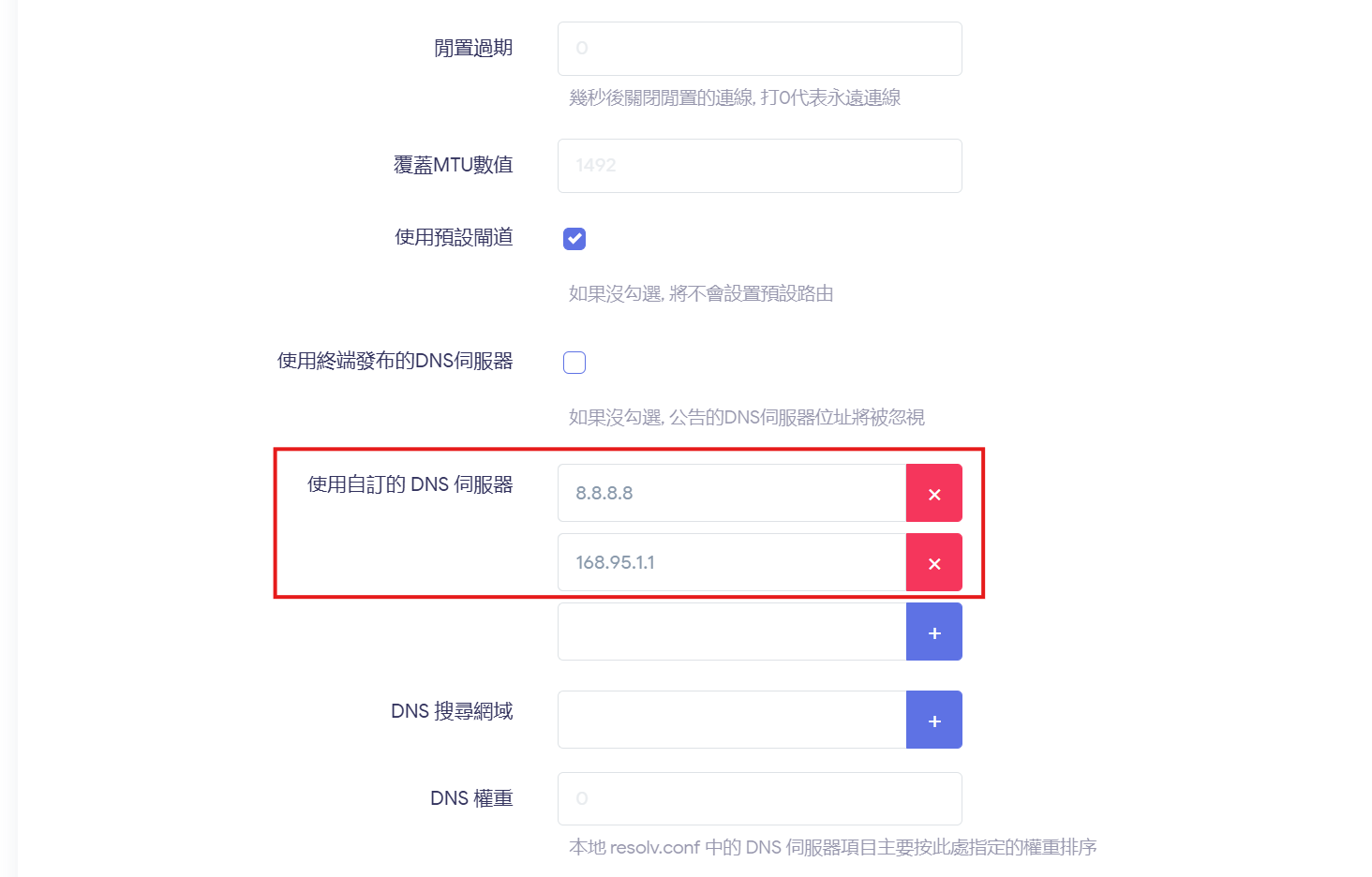 若不勾選使用終端發布的DNS伺服器,可自訂要使用的DNS