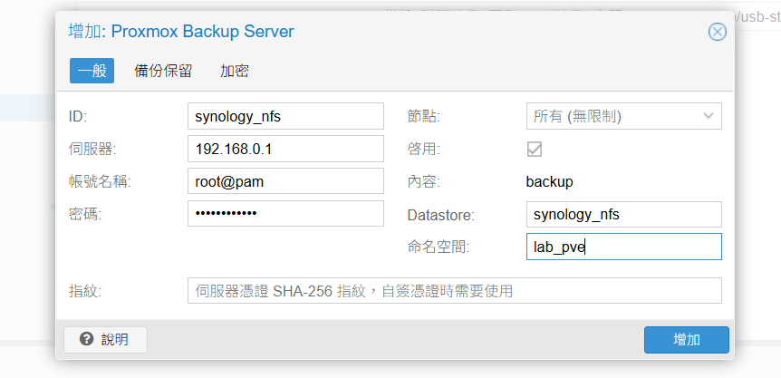 PVE 新增 PBS 時,輸入新增的命名空間