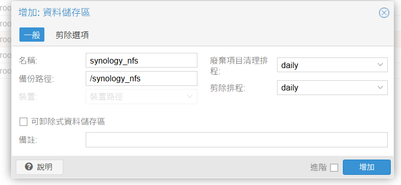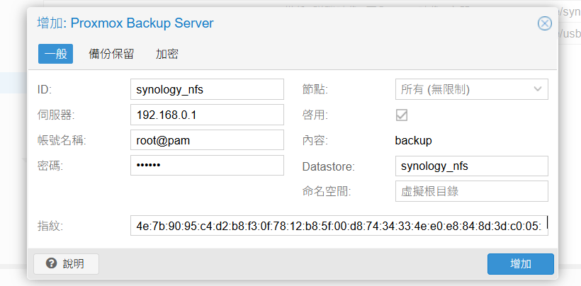 在PVE網頁上新增PBS資訊,帳號這裡求方便直接使用PBS 的root帳密,可以自行建立帳號並給予資料儲存區相應權限