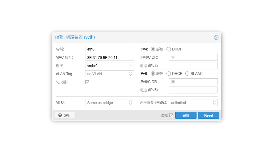 進入PVE SHELL修改LXC設定,編輯/etc/pve/lxc/<lxc-id>.conf,新增以下設定後啟動CT