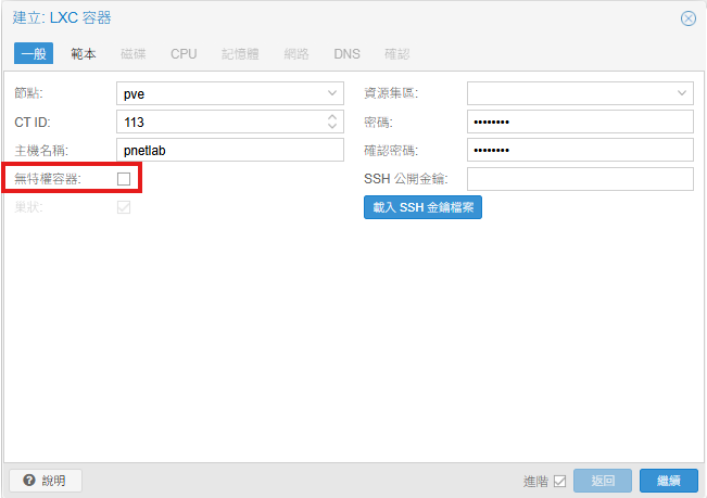 取消勾選無特權容器,範本選擇ubuntu-18.04,建立容器後選擇不開機