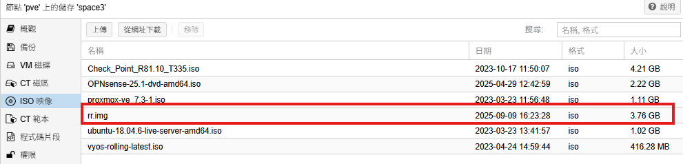 qm importdisk 500 /mnt/pve/space3/template/iso/rr.img space3