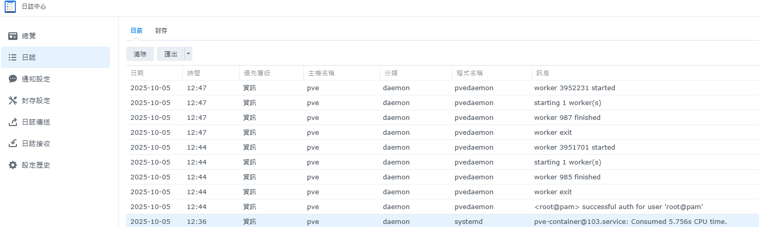 使用Synology日誌接收,確認有PVE的log