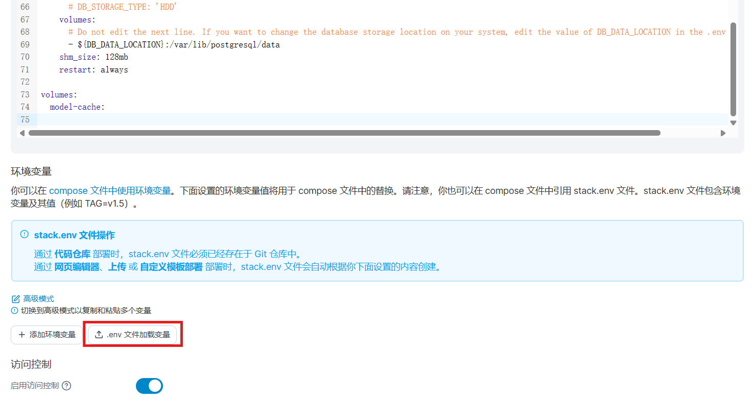 將docker-compose.yml內容貼到Stack編輯器,並上傳剛剛修改的.env檔案