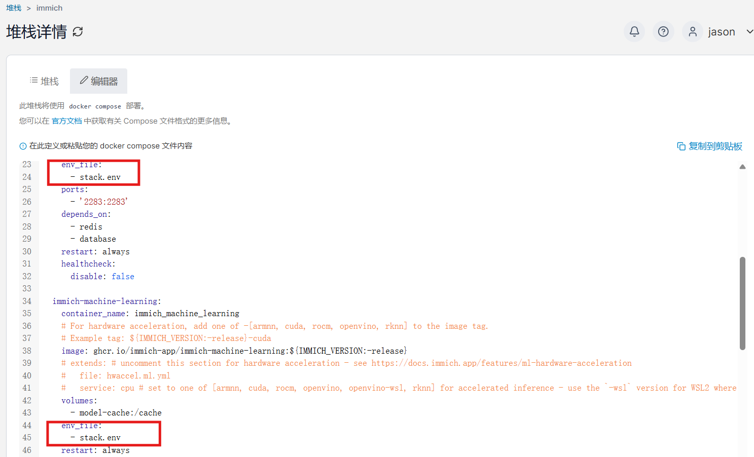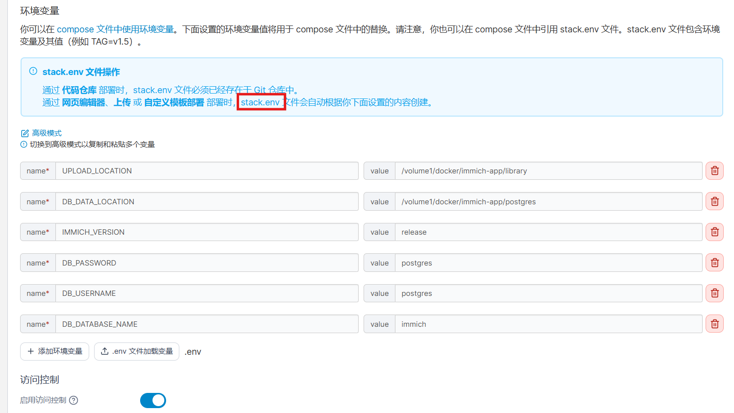 上傳後確認以下環境變量正確,並將編輯器內的- .env改成- stack.env