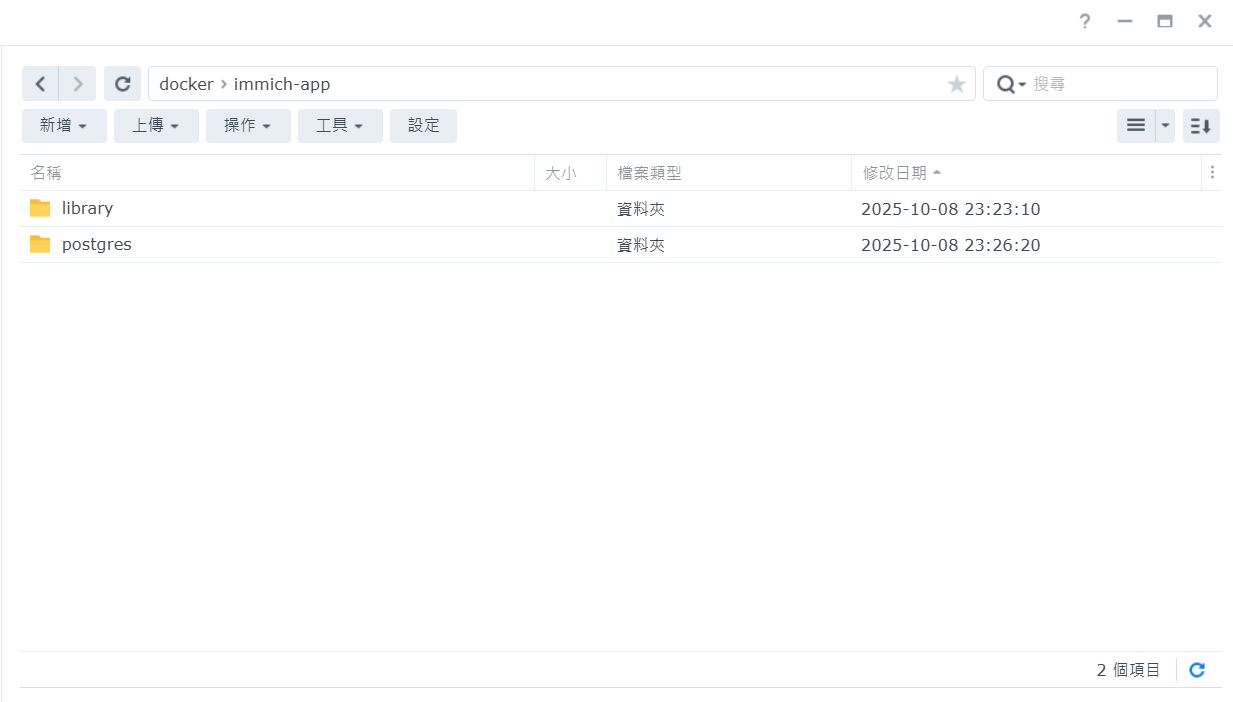 確認已安裝Portainer,在docker資料夾新增immich-app,裡面新增library和postgres資料夾